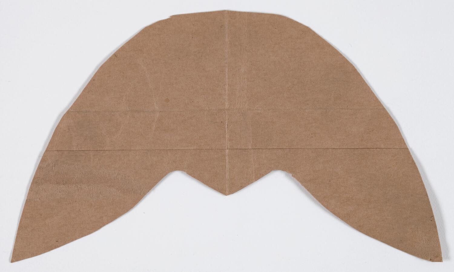 Created from brown paper, this handmade 'U' shaped pattern is finished with an upper ornate 'W' shape. Although exhibiting central vertical and horizontal creaselines, this pattern's upper third section has been duplicated and attached to provide the top portion with a double paper thickness.