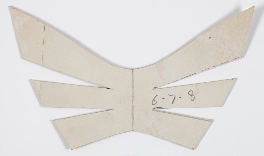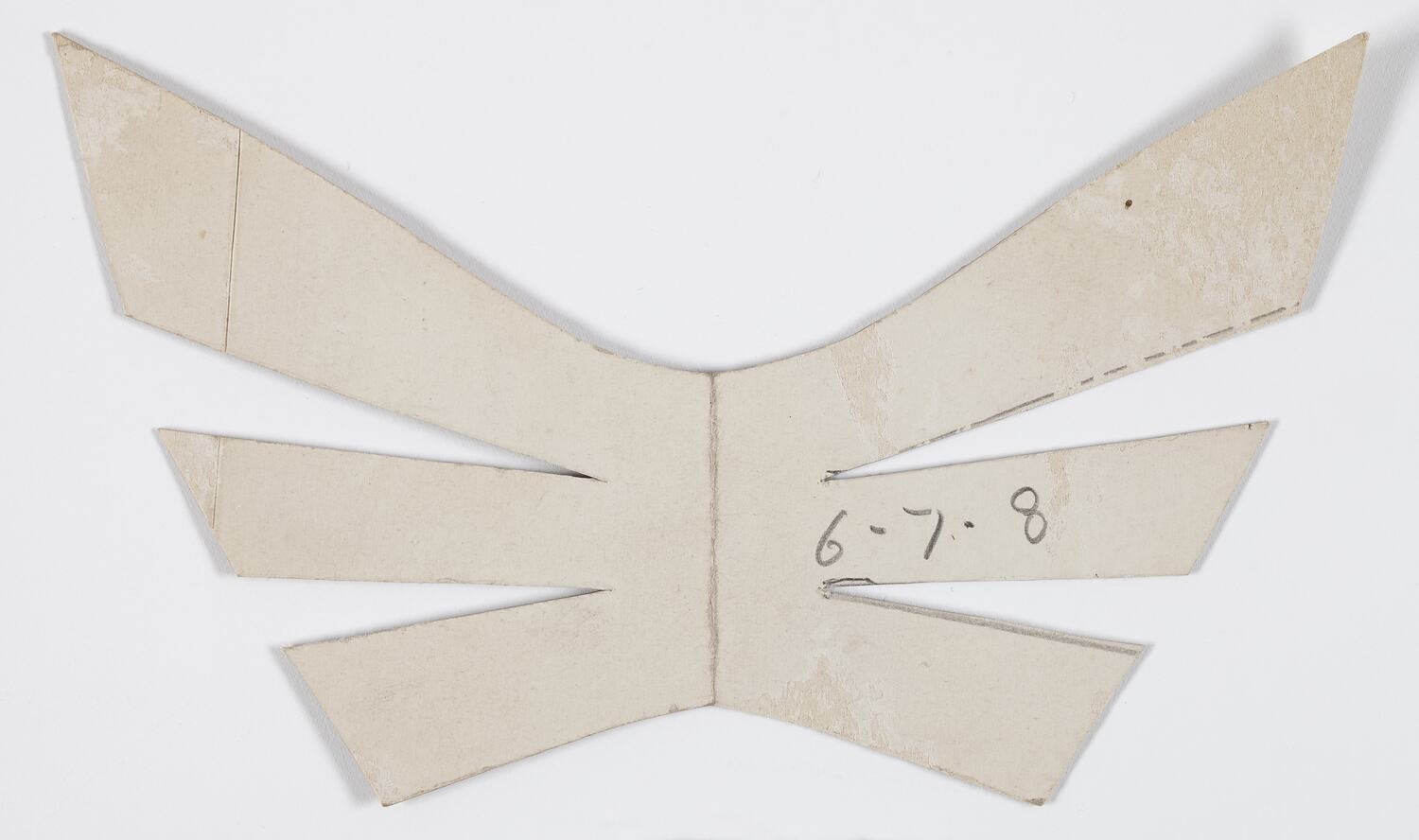 Symmetrical in form, this central-spined, six horizontal pronged-shaped pattern is created on cream coloured cardboard. The front exhibits several ruled pencil lines and text.