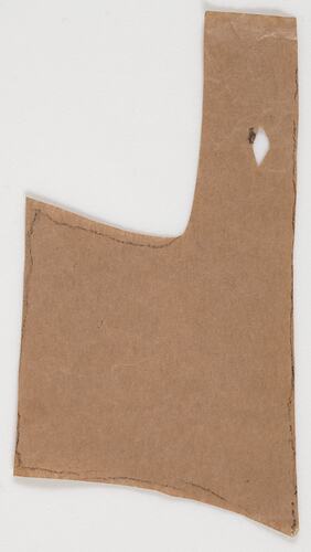 Brown coloured paper 'L' shaped pattern. All edges, except the lower right, exhibit random pencil drawn lines. Centrally located within the lower right region is diamond shaped cutout. Although in good shape, the paper exhibits various crease marks.