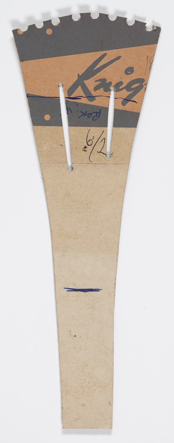 Grey cardboard shaped within a fan shaped cut-off conical form. Encompassing all outer edges are the remnant pencil cutout lines. Top edgeline displays half hole-punch marks referencing ornate pattern. Central upper region has a pinhole puncture flanked by two elongated cutout slits; the right measures 4cm in length and the left 3cm. Inset approximately 2mm from the left cutout slit's top and base points are two (one on each end) singular horizontal pen lines that intersect and cross over the cutout. Located at the lower third mark point a pencil line runs horizontal across the pattern's width. The reverse is a brown, orange and cream matt commercial surface complete with text. Although in good condition, there is a fold mark at the upper thirdway point.