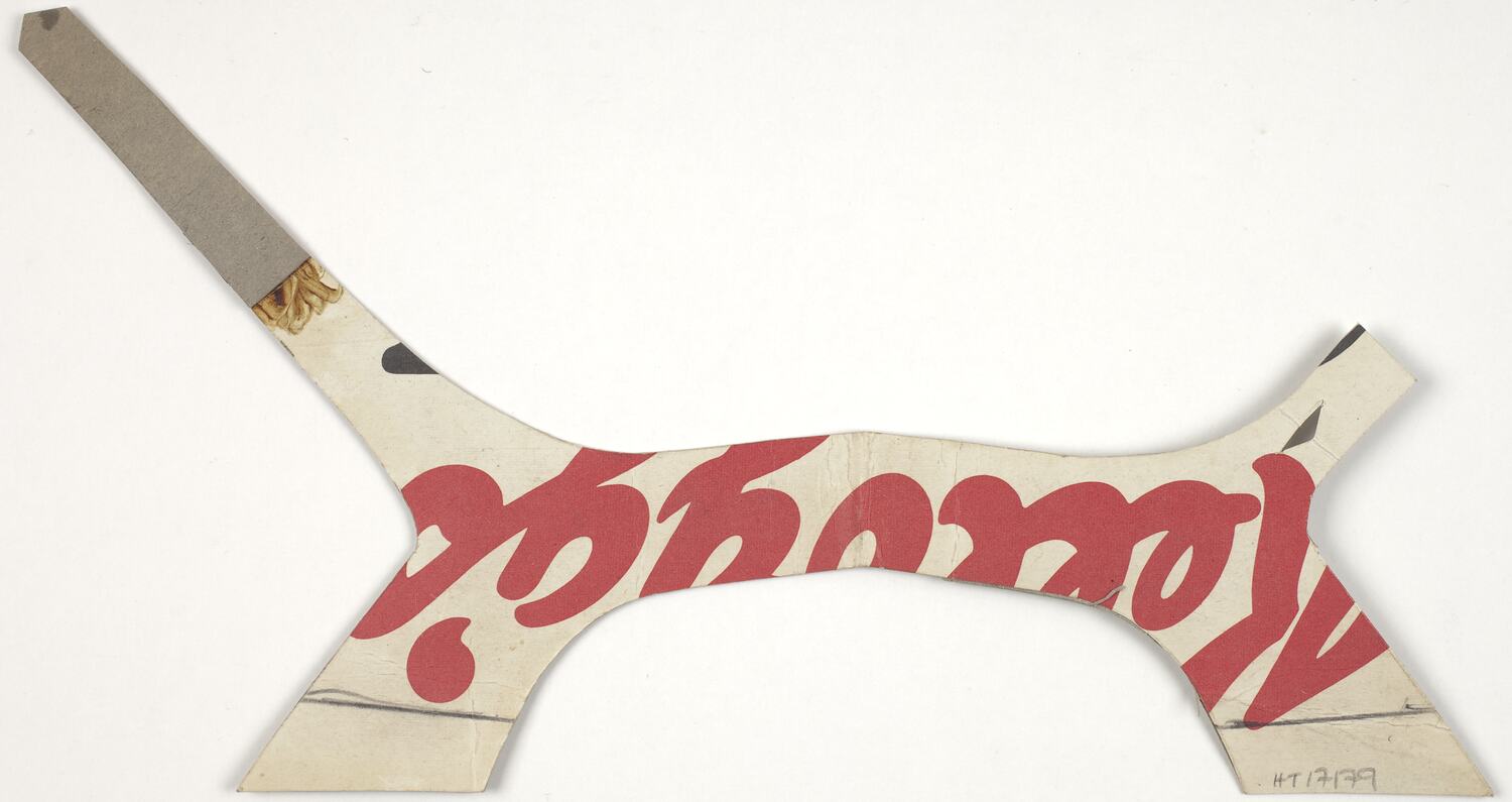 Hand made from an Australian Kellogg's cereal cardboard box, this heel strap pattern resembles two 'Y' shapes joined at the vertical lines base and placed sideways. The lower portion is cut into thicker section, while the upper portion is thinned possibly for strapping purposes. The upper right extends approximately 12.5cm (the last 4.5cm is added white cardboard in which yellow hued glue traces remain), the left has been shortened (approx. 3.5cm length) and a triangular shaped puncture inserted, (button hole). At the pattern's centre, the piece exhibits a crease line and 'N = 1x2' is pencilled in cursive script. The reverse side is white in colour and has the tradename 'Kellogg's' printed in red across the pattern's thickest point. Top portion illustrates two pencil lines drawn horizontally, while the lengthened strap exhibits the added on piece and a brown smudging suggests an adhesive material. Although this pattern appears in good condition, it exhibits several crease such as the central fold or that located perpendicular to the triangular button hole or usage stress lines and creases as seen within the lower pattern portions.