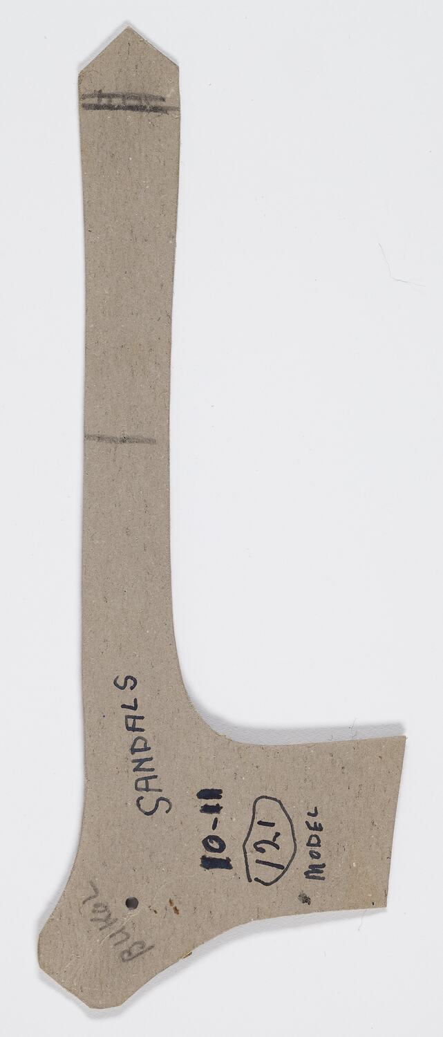 This grey cardboard 'L' shapped pattern with its various text of 'Sandals, 10-12, 121 model' referencing type, size and model number was most likely used by Stanio Fancoff as part of his shoe patterning schemata sometime between the 1930s and 1970s. Along with many others, this pattern was an integral part of Stanio's shoemaking craft and business.