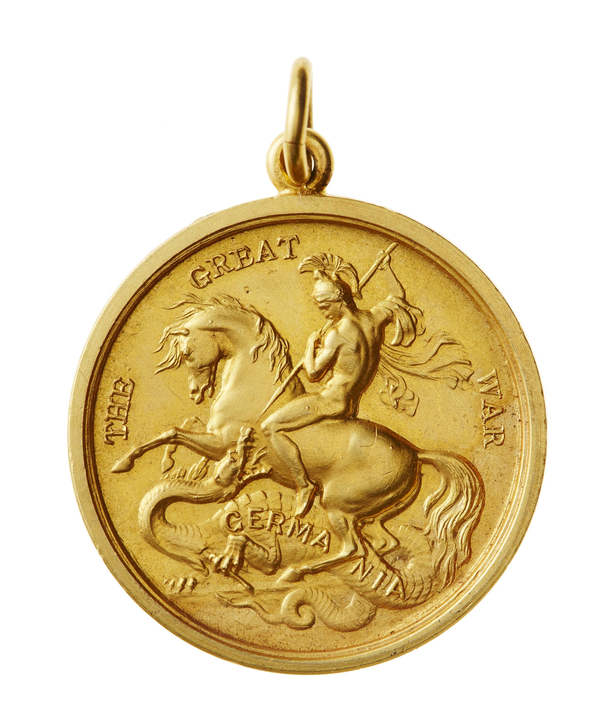 St George on horseback to left spearing a fallen dragon inscribed GERMANIA; around, THE GREAT WAR.