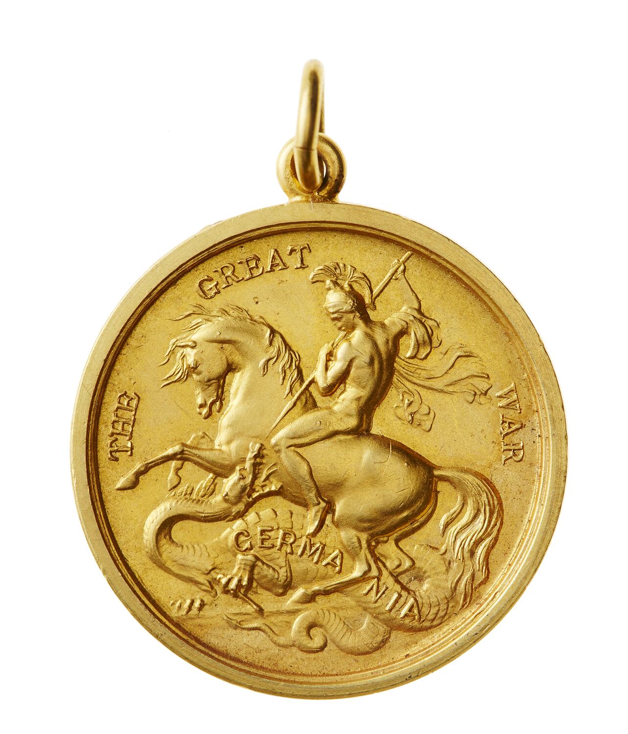 Round medal with loop and split ring at top. Obverse depicts St George on rearing horseback spearing a depiction of Germany as a dragon-like serpent. Reverse bears inscription.