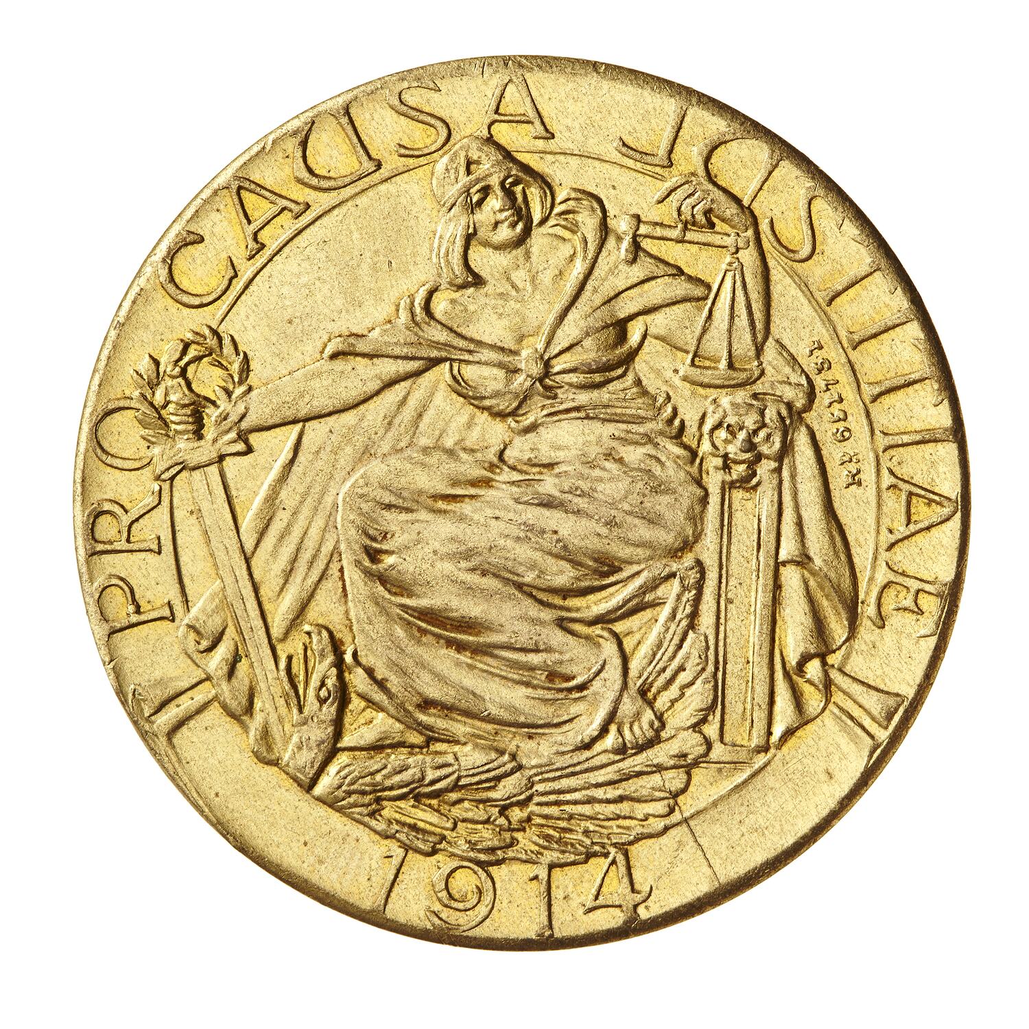 Inscription reads: "PRO CAUSA IUSTITIAE / 1914". (For the Sake of Justice).