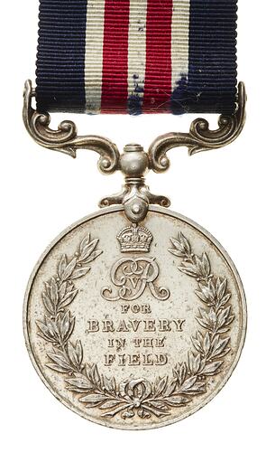 A round silver medal (36 mm diameter) with mount and ribbon. The obverse features a bust of George V wearing field marshal's uniform, head bare, facing left; around, GEORGIVS V BRITT: OMN: REX ET IND: IMP:; the artist's initials B.M. (Bertram MacKennal) are on the bust truncation. The reverse has the Royal cypher GVR (George V King) above the legend FOR BRAVERY IN THE FIELD within a laurel wreath with crown at top. The edge is impressed 18 SAPR A.L.B. HAMPTON. 2/ FD: CO. AUST. E.