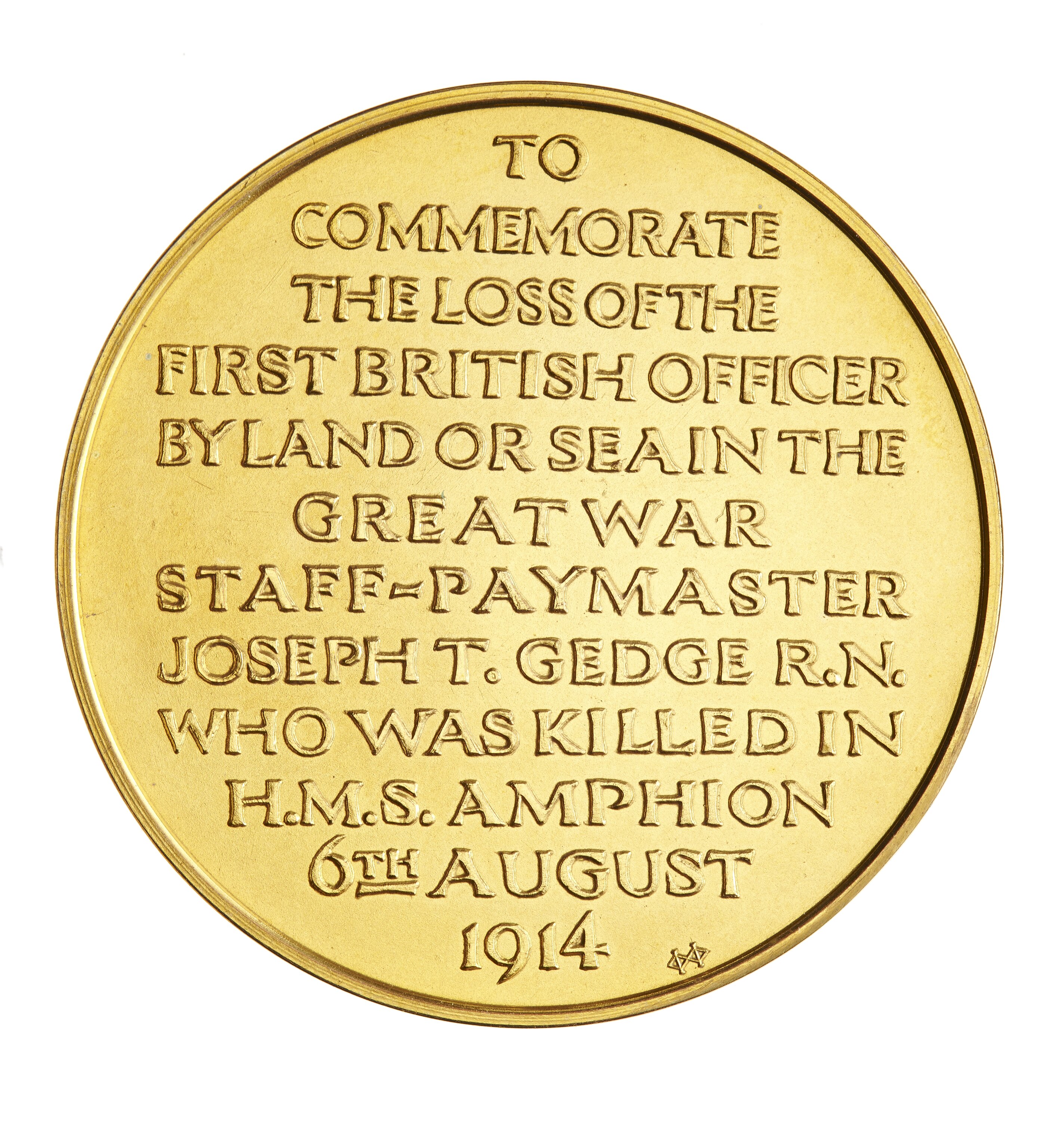 Medal commemorating the Death of the First British Officer during World War I, Staff Paymaster Joseph T. Gedge, of the H.M.S. Amphion. He was killed in action on 6 August 1914.