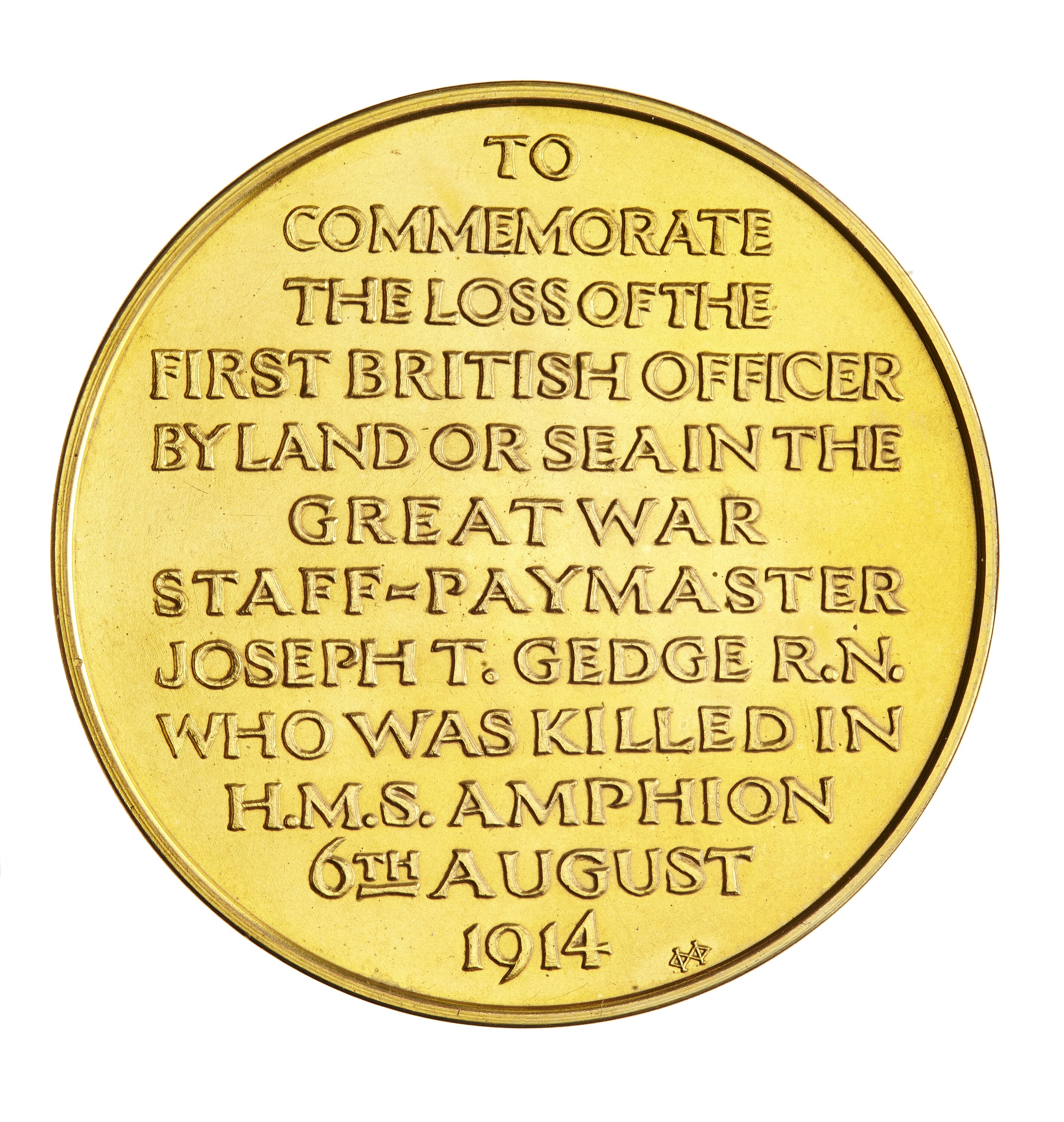 Medal commemorating the Death of the First British Officer during World War I, Staff Paymaster Joseph T. Gedge, of the H.M.S. Amphion. He was killed in action on 6 August 1914.