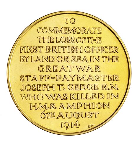 Obverse; 'TO / COMMEMORATE / THE LOSS OF THE / FIRST BRITISH OFFICER / BY LAND OR SEA IN THE / GREAT WAR / STAFF-PAYMASTER / JOSEPH T. GEDGE R.N. / WHO WAS KILLED IN / H.M.S. AMPHION / 6TH. AUGUST / 1914'. Reverse; 'FOR PROFESSIONAL MERIT'. Edge; 'SPECIMEN GILT'.