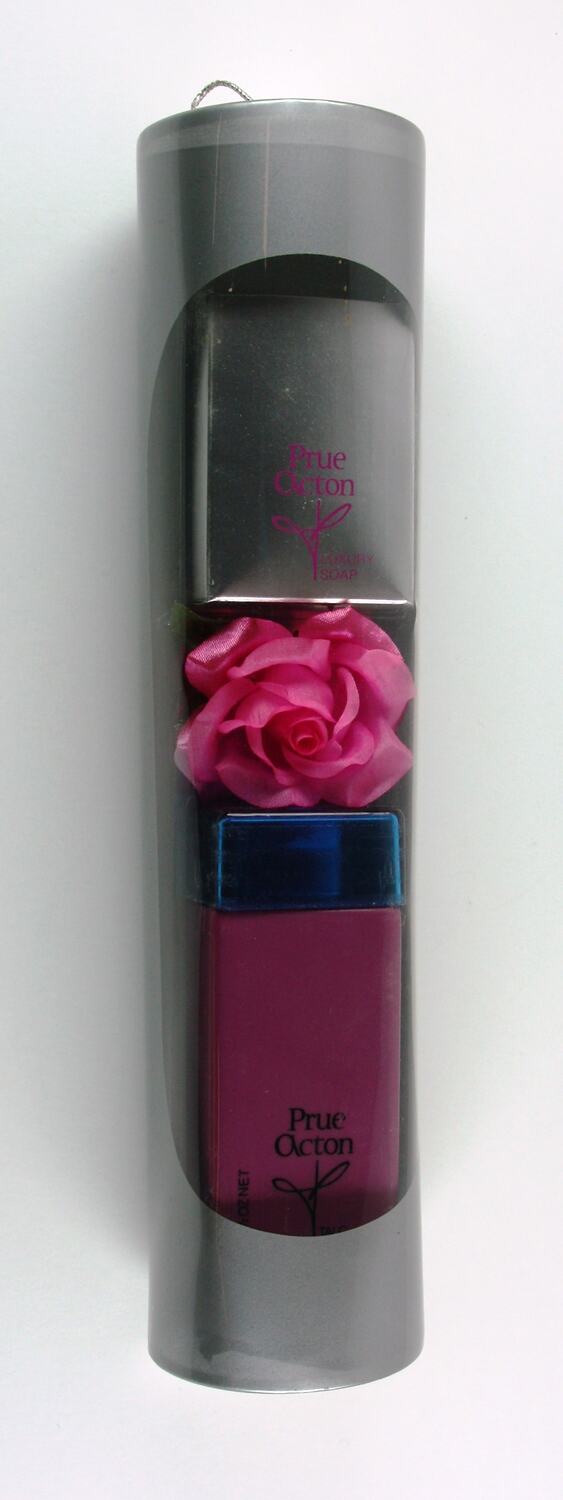 Consists of a tubular clear plastic container, with a cardboard stopper at each end, the top one threaded with a silver woven loop. Inside is a silver cardboard and clear plastic insert containing a bar of soap in a silver cardboard box, a pink fabric rose, and a purple plastic container of talcum powder with a blue plastic lid. Soap and talcum powder (100g) still inside containers.