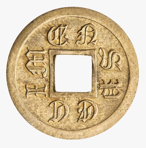 Coin with square central hole with the English word SPECIMEN around the hole.