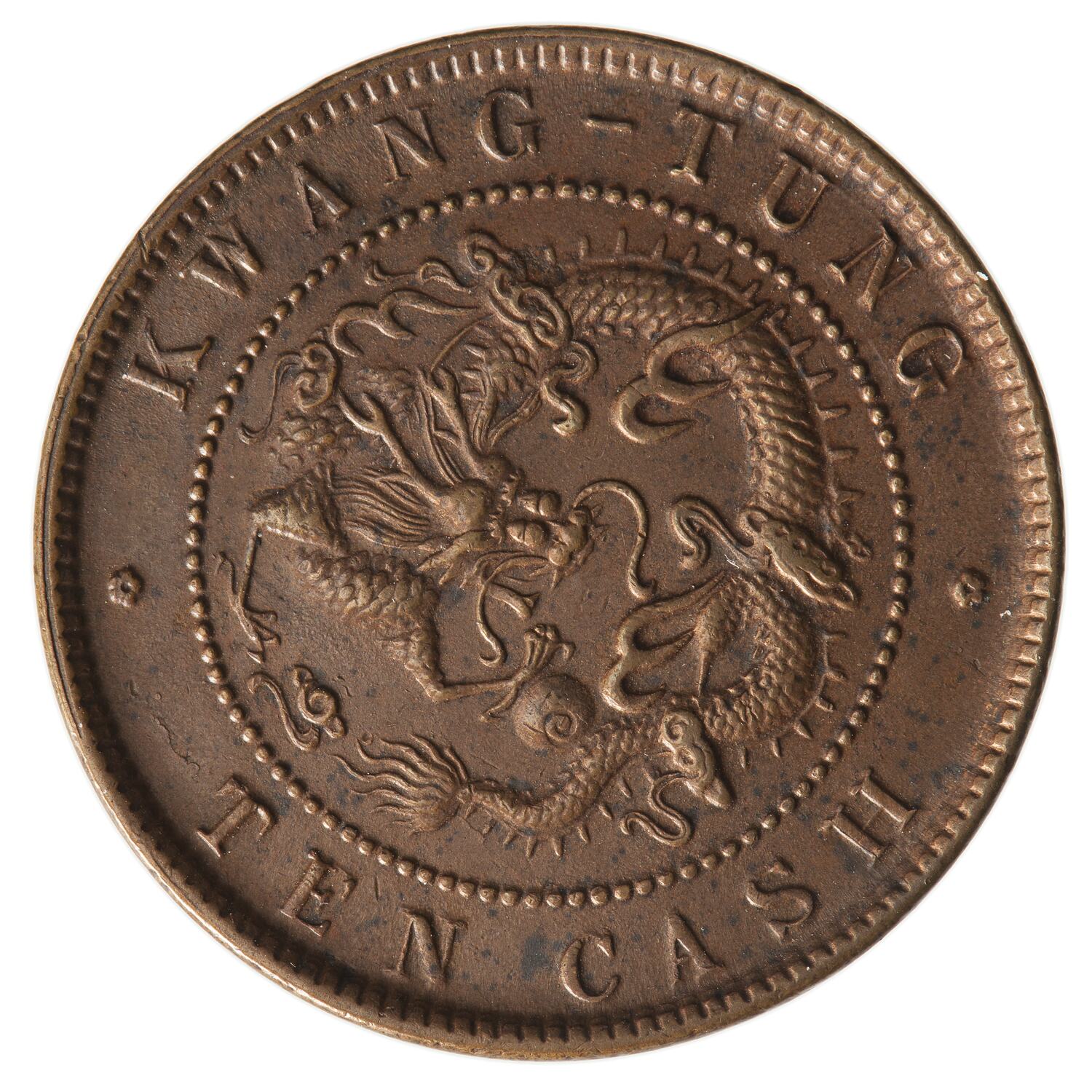 At centre within a circle of beads, a dragon, facing; around above, KWANG-TUNG; around below, TEN CASH