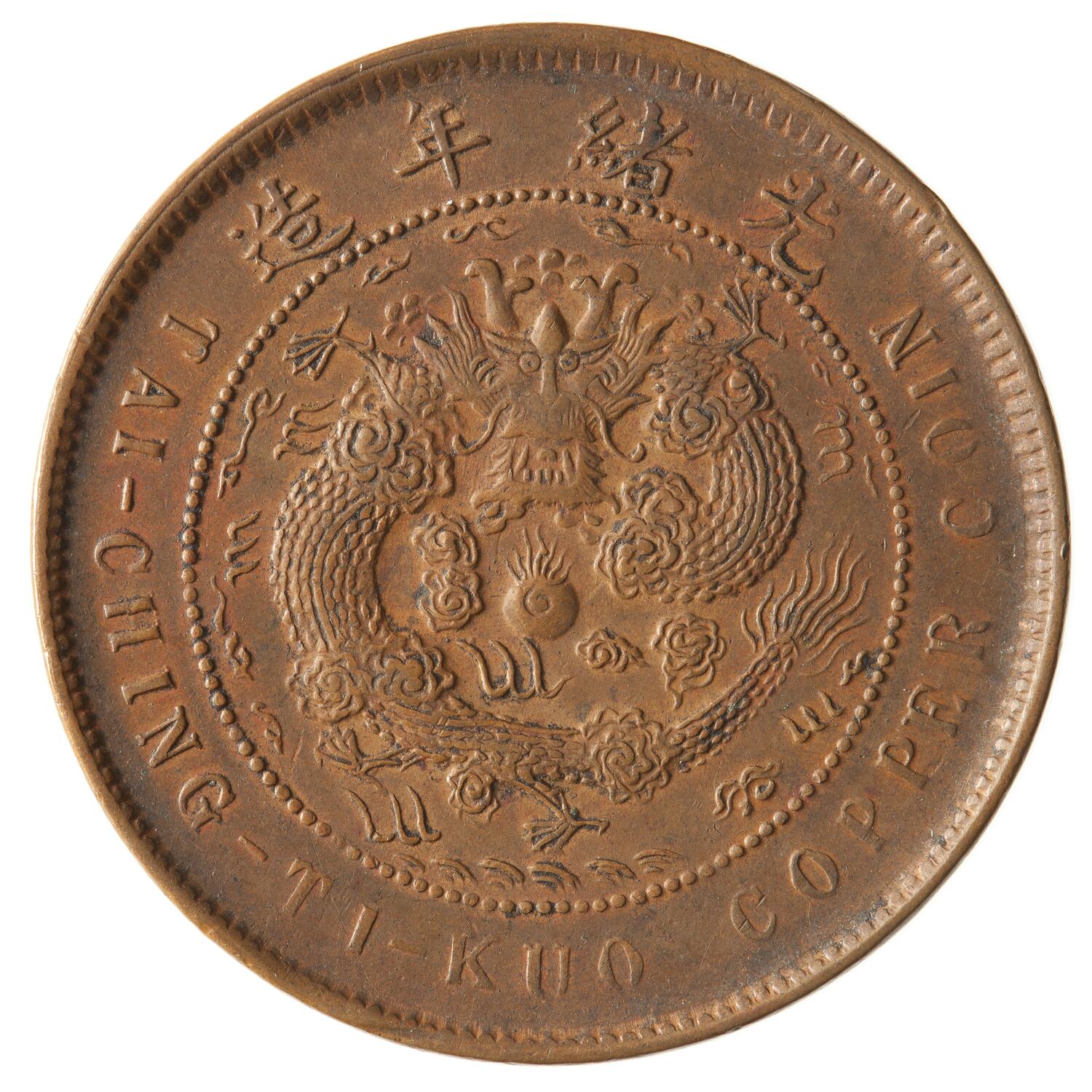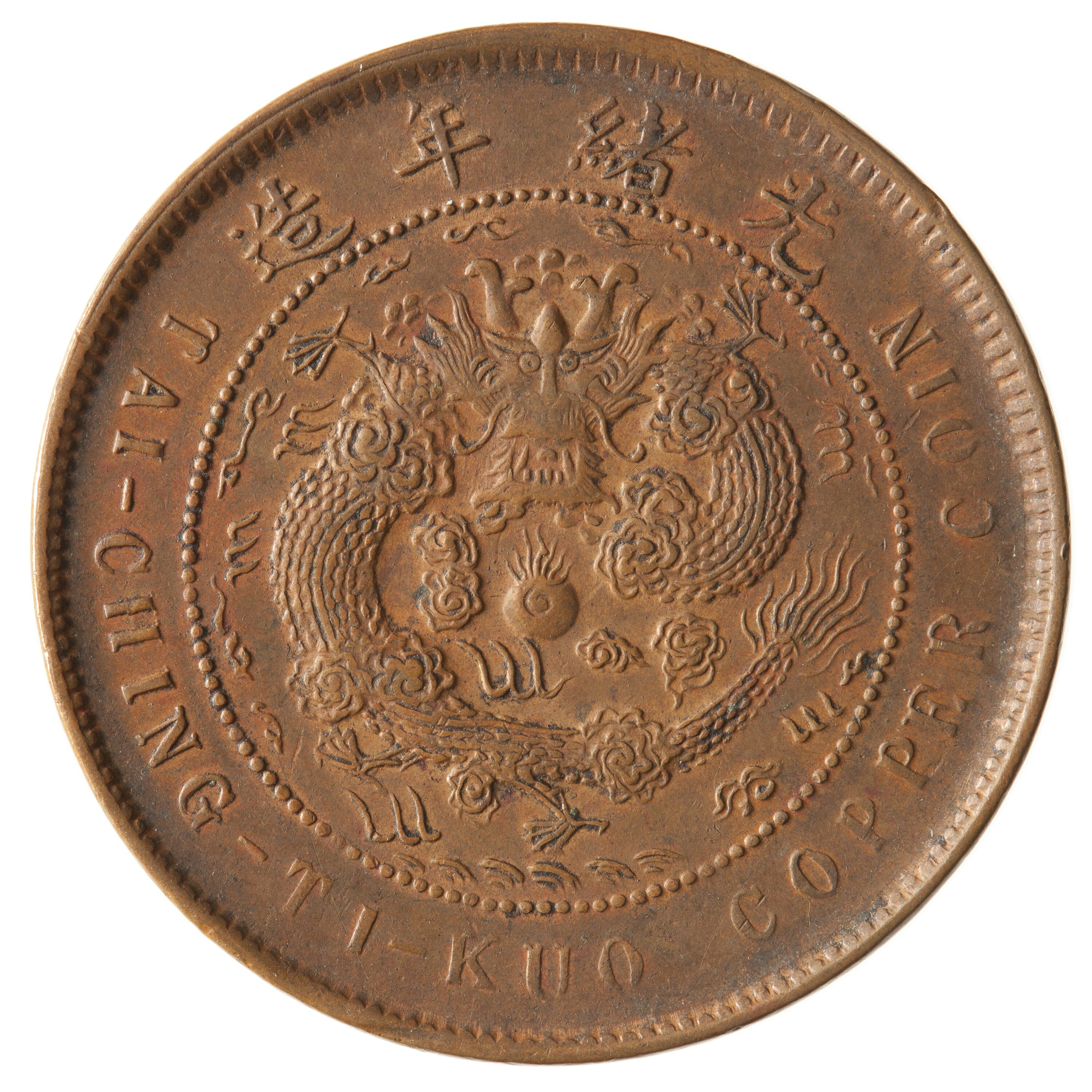 A dragon facing; around above, legend in Chinese; around below, TAI-CHING-TI-KUO COPPER COIN.