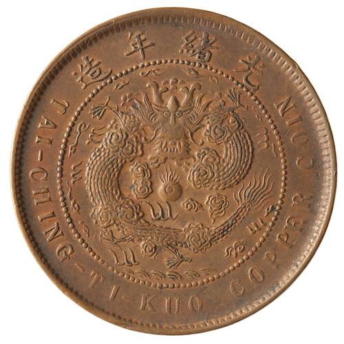 A round bronze coin (28 mm dia). The obverse features a dragon facing; around above, legend in Chinese; around below, TAI-CHING-TI-KUO COPPER COIN. The reverse has four Chinese characters within a central circle set around the mint mark incuse in Chinese on a central bead; around, legends in Chinese and Manchu characters (the Cyclical Date, 1907, is given by the characters which start and end the legend at the top of the coin). The edge is plain