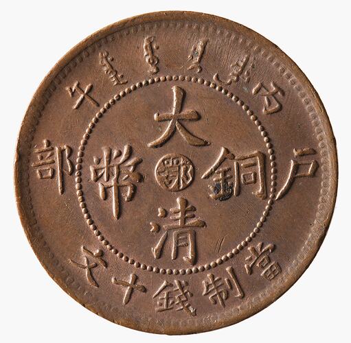 At centre, a raised circle with the Chinese mint character 'o' incuse, around within circle of beads four Chinese characters; around, outside circle of beads, 11 characters (those at left and right sides for Board of Revenue)
