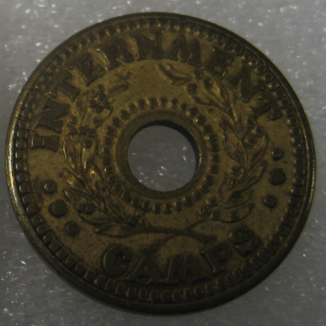 Hole in centre. Circle of beads, with another circle of beads around hole. Wreath around inner circle. Around, INTERNMENT ... CAMPS ...