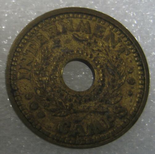 This is an internment camp token - one penny - issued for use as currency in internment camps, during the 1940s. It belonged to Karl Muffler. Karl was interned as a German enemy alien at Tatura Internment Camp from 1939 to 1944, and was then released to the Civil Aliens Corp Melbourne on 27th June 1944. He was then transferred to Broadford until his release in 1945.