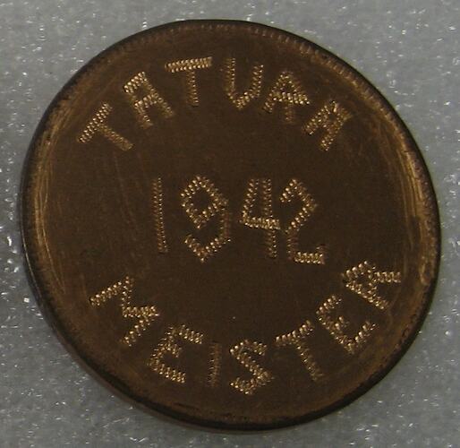 This is an Australian 1938 penny, converted into a medal memento of Tatura internment camp, and inscribed: 'Tatura Meister 1942' ('meister' the German term for 'master' as in master craftsman'.) It belonged to Karl Muffler from his time in Tatura during the War and was awarded to him by fellow internees in recognition of his confectionery services provided in Tatura camp. Karl Muffler was interned as a German enemy alien at Tatura Internment Camp from 1939 to 1944, and was then released to the Civil Aliens Corp Melbourne on 27th June 1944. He was then transferred to Broadford until his release in 1945.