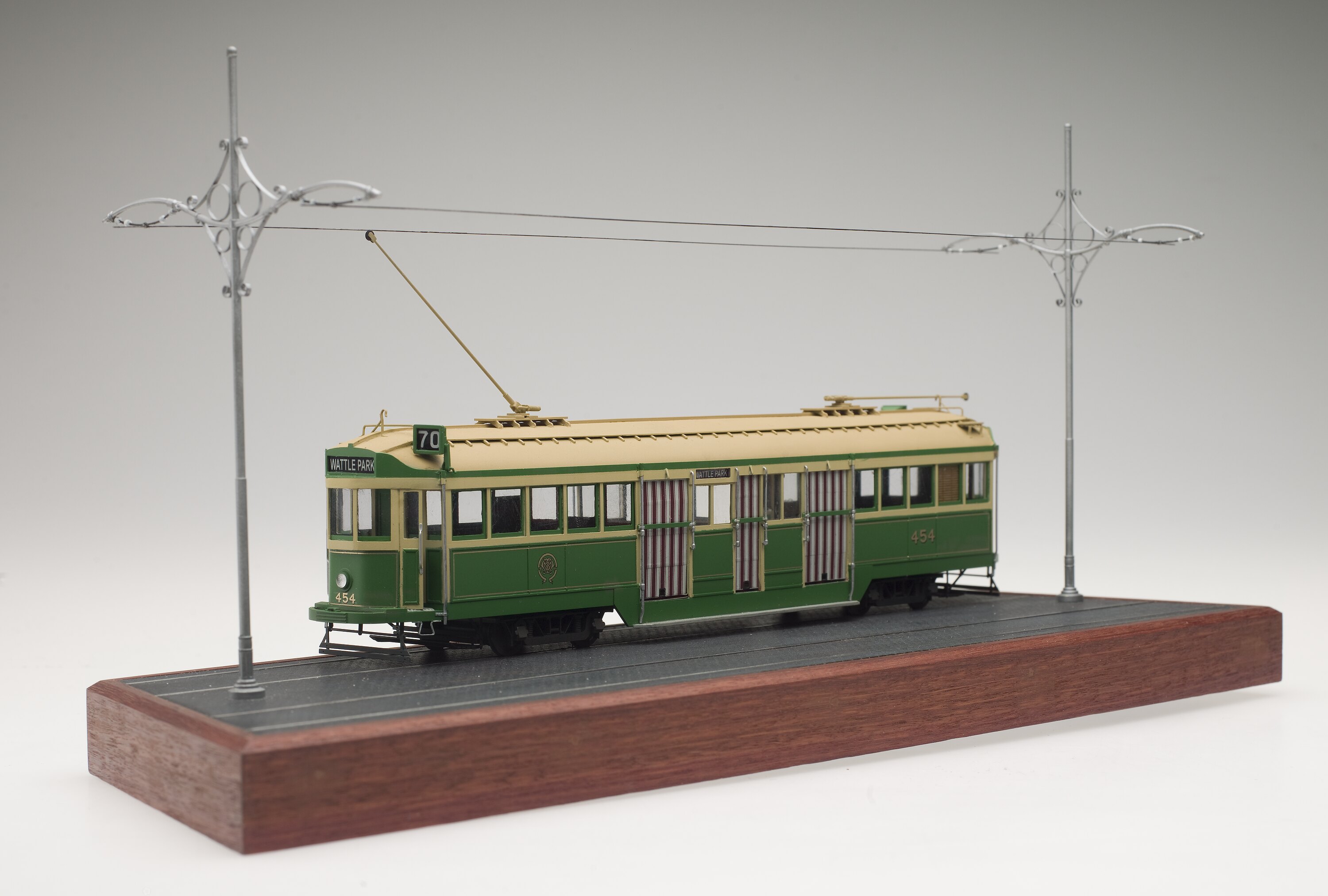 Tram No.454 was based from new at the Camberwell Tram Depot on Riversdale Road, typically working on City-Wattle Park route 70, City-Burwood route 74 and City-Prahran route 77. The model depicts the tram destined for the Wattle Park terminus of route 70. First established by the Hawthorn Tramways Trust in 1916, the Wattle Park route ran from the Princes Bridge terminus along Batman Avenue, Swan Street and Riversdale Road to terminate at Elgar Road, South Box Hill. It was named after the 137 acre (55.4 hectare) public park in Riversdale Road that as established by the Hawthorn Tramways Trust in 1917, modelled on the American trolley parks designed to draw weekend patronage to the end of new tram lines. The park was later operated by the MMTB until 1983, then by the Metropolitan Transit Authority (the MET) until 1991. From 1937, Tram No.454 was based at the Essendon Depot in Mount Alexander Road.