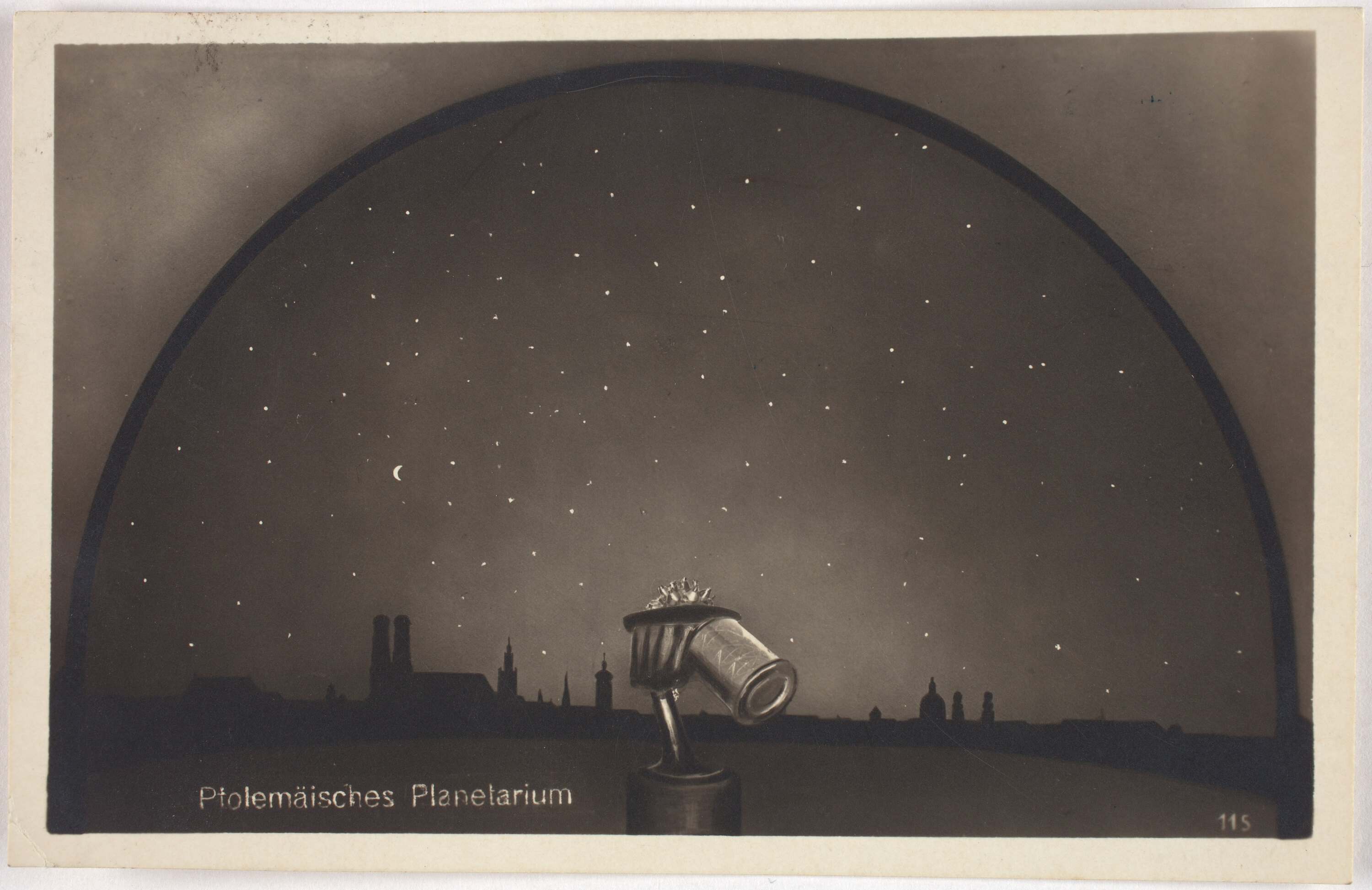 Postcard, black and white, featuring illustration of night sky titled: 'Ptolemaisches Planetarium'. On the reverse is a letter to Karl Muffler from his father in Germany, addressed to him as Konditor on the Cap Polonio, Lisbon, Portugal, 16/12/1926.