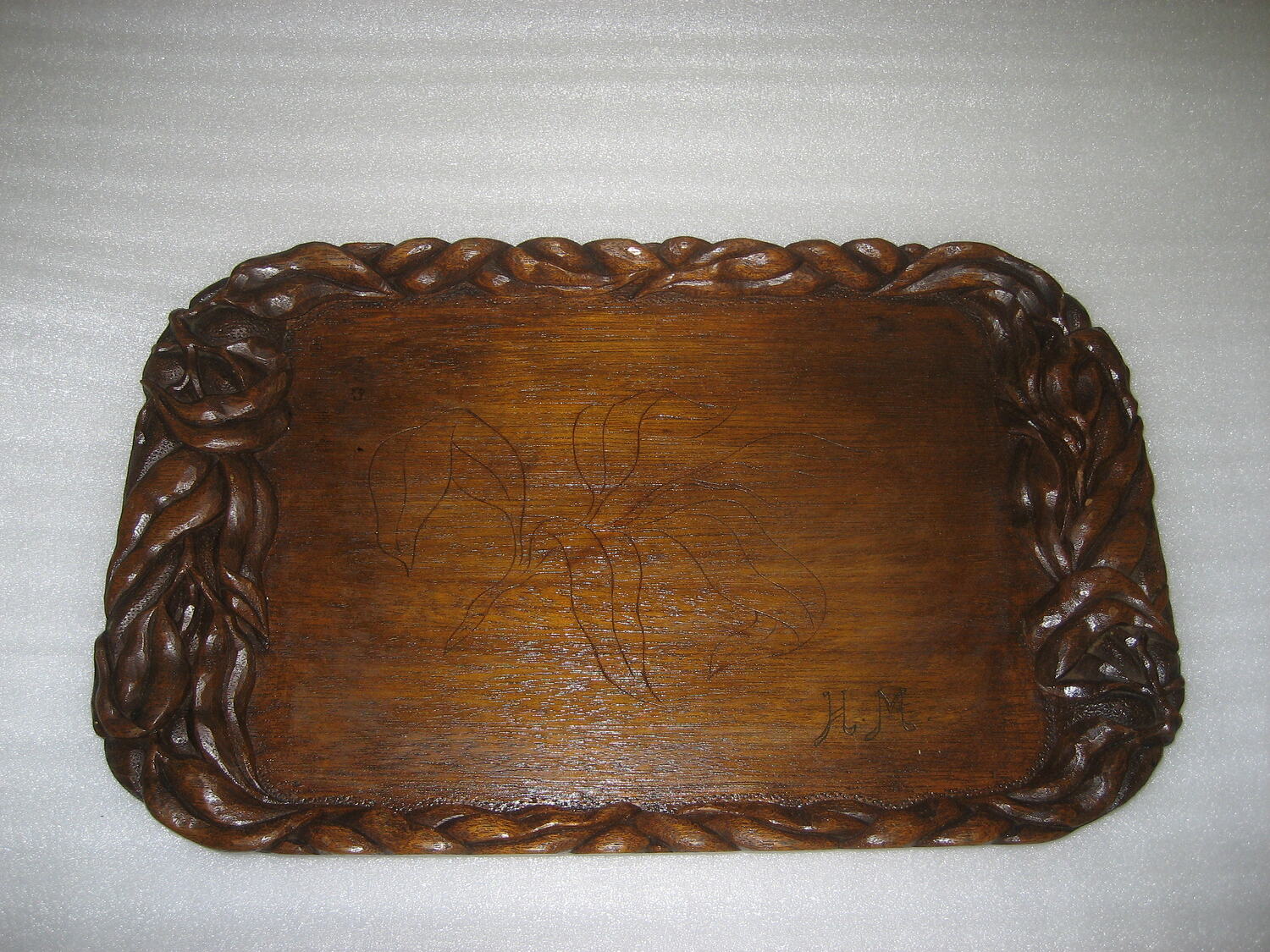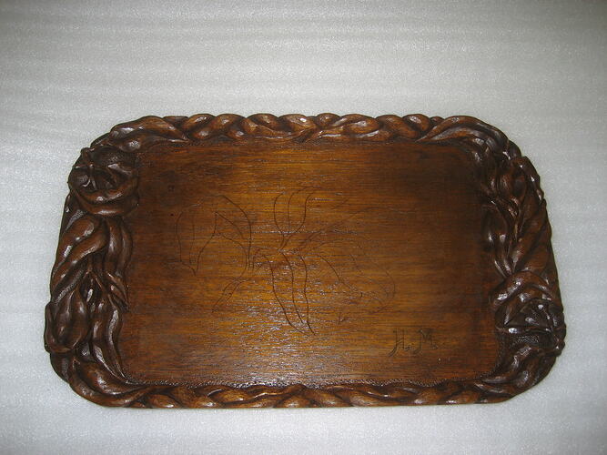 Carved wooden tray made by Karl Muffler for his wife Hilde during his internment at Tatura Internment Camp between 1939 and 1944. The initials 'HM' have been carved into the tray. The tray demonstrates the kind of activities undertaken by interns (often instructed by other interns) to keep themselves occupied. Many internees produced craft during their time in internment camps and the Tatura World War II Wartime Camps and Irrigration Museum has a similar tray in their collection. Karl Muffler was interned as a German enemy alien at Tatura Internment Camp, from 1939 to 1944.