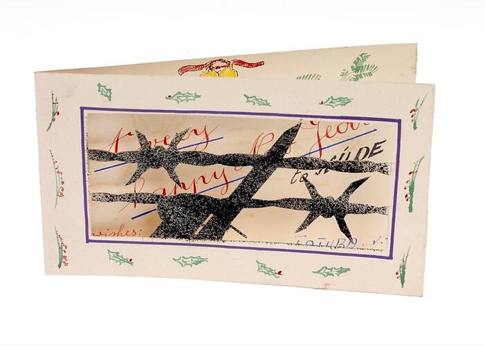 This is a hand-made card in coloured ink, with holly leaves surrounding border and a cutout barb-wire motif. It was send from Karl Muffler to his wife Hilde as a Happy New Year greeting card, from Tatura Interment Camp in northern Victoria. Karl Muffler was interned as a German enemy alien at Tatura, from 1939 to 1944.