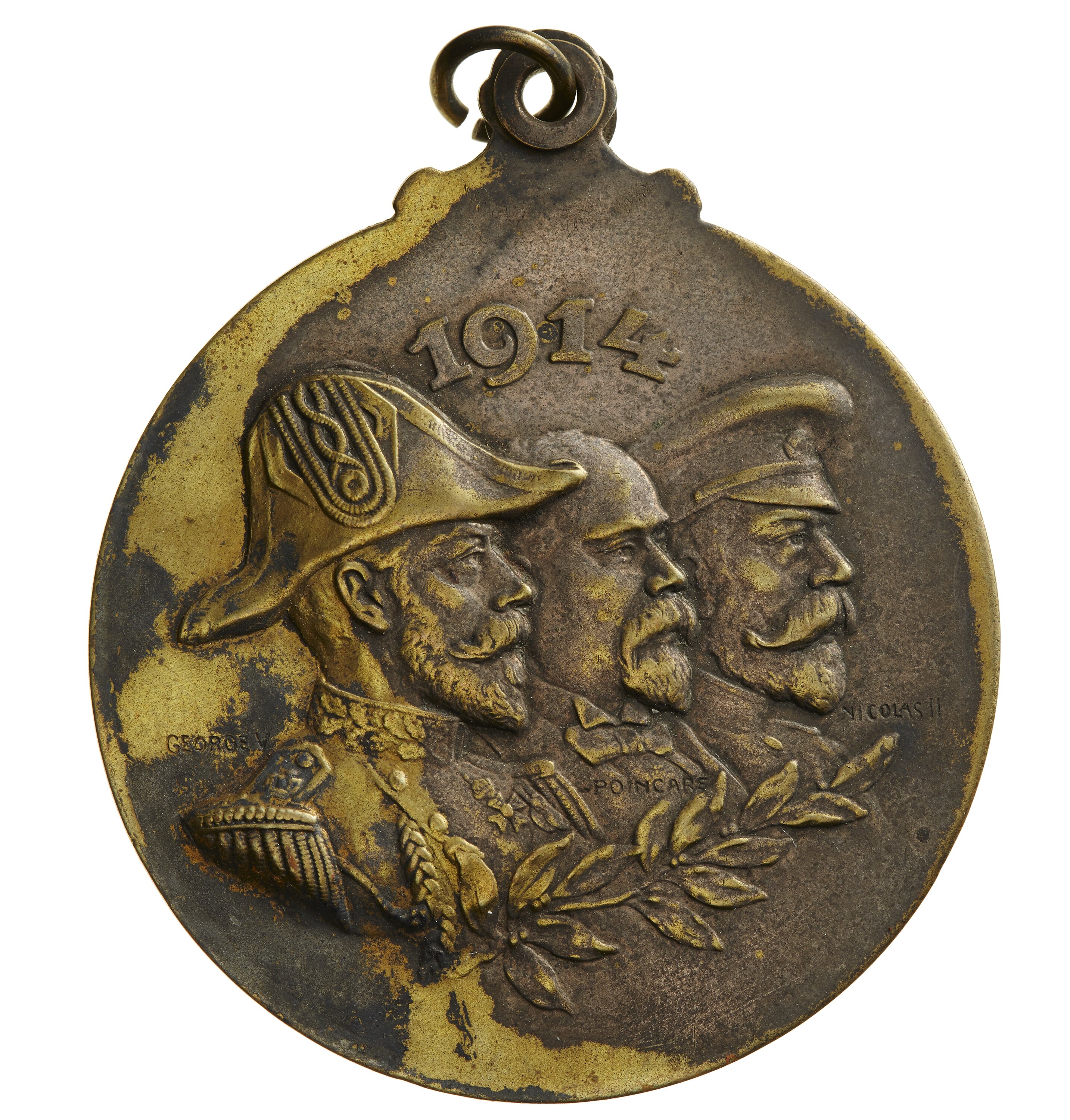 Medal features three of the allied leaders of World War I; King George V of the United Kingdom, French President Poincare and Czar Nicholas II of Russia.