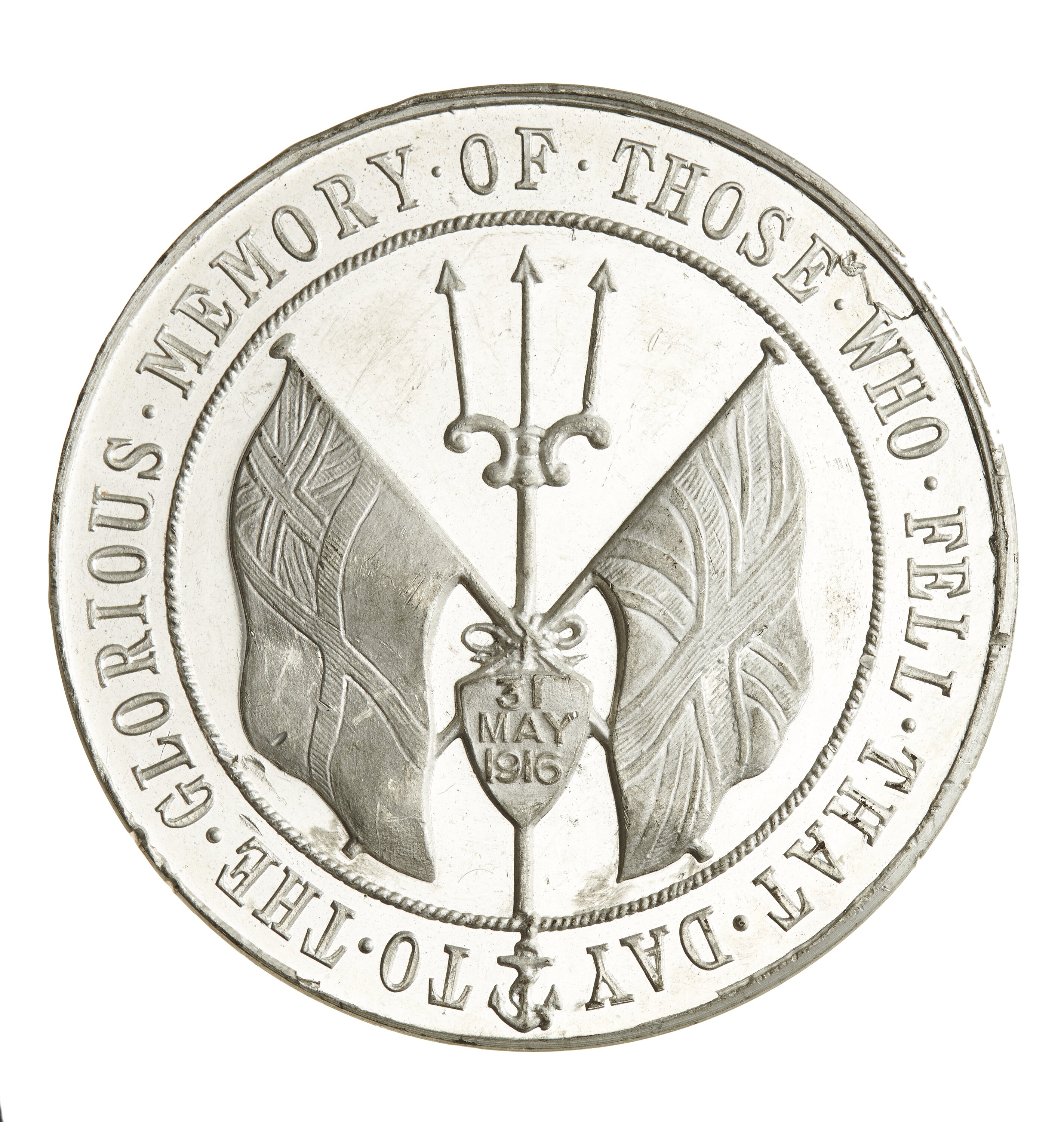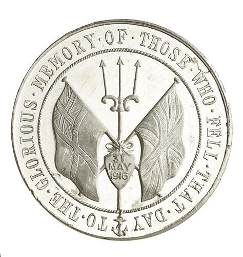 The reverse depicts a trident on which crossed White Ensign and Union flags and a small shield with 31 MAY 1916; around, TO THE GLORIOUS MEMORY OF THOSE WHO FELL THAT DAY.