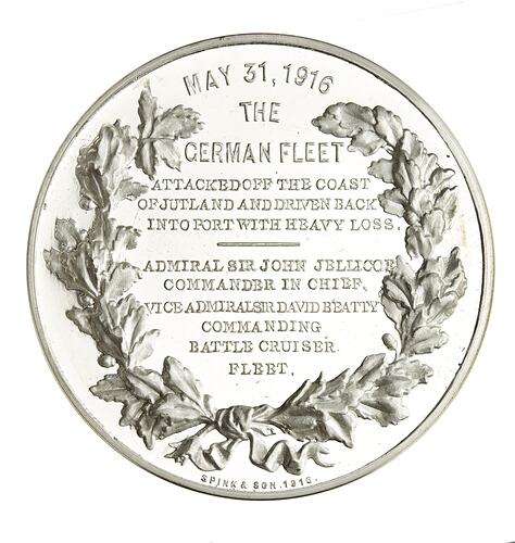 The obverse features a legend in 12 lines within an oak wreath, MAY 31 1916 THE GERMAN FLEET ATTACKED OFF THE COAST OF JUTLAND AND DRIVEN BACK INTO PORT WITH HEAVY LOSS. ADMIRAL SIR JOHN JELLICOE COMMANDER IN CHIEF. VICE ADMIRAL SIR DAVID BEATTY COMMANDING BATTLE CRUISER FLEET.