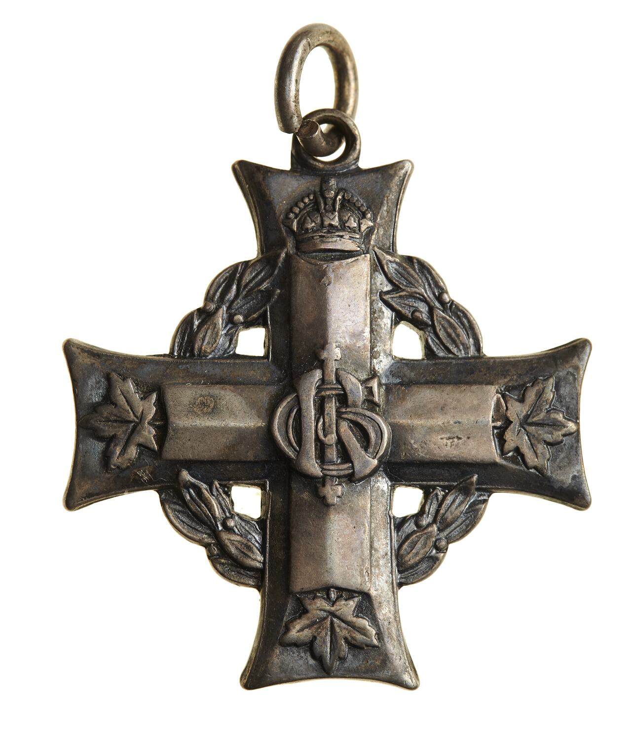 Cross shaped silver medal with loop at top, a laurel wreath between the arms; a crown above the top arm of the cross and a maple leaf at the end of the other arms; at the centre the royal cypher GRI with the ends of the letter I extended and formed into small crosses.