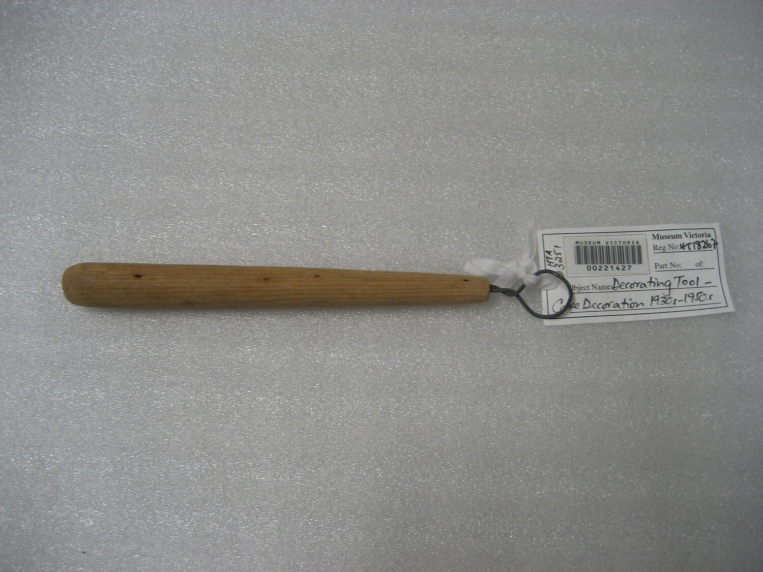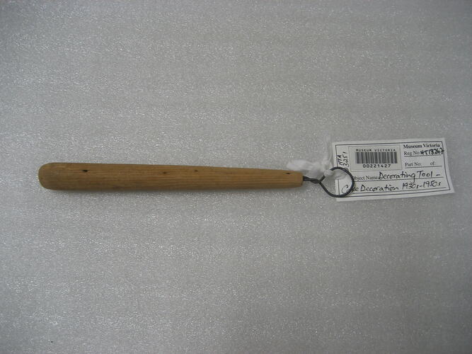 One of three different 'grooving tools' with wooden handles and metal ends, used for dipping small cakes and chocolates into various coatings. The tools belonged to German pastry chef Karl Muffler and used by him during his career as a pastry chef in Melbourne from the 1930s and during teaching cake decorating at William Angliss College during the 1940s.