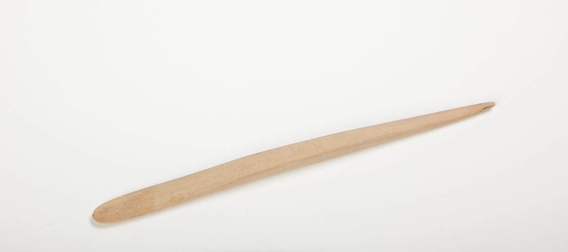 One of six wooden modelling tools of varying shapes and sizes used for hand modelling marzipan-style flowers. The tools belonged to German pastry chef Karl Muffler and used by him during his career as a pastry chef in Melbourne from the 1930s and during teaching cake decorating at William Angliss Food Trades School during the 1940s.