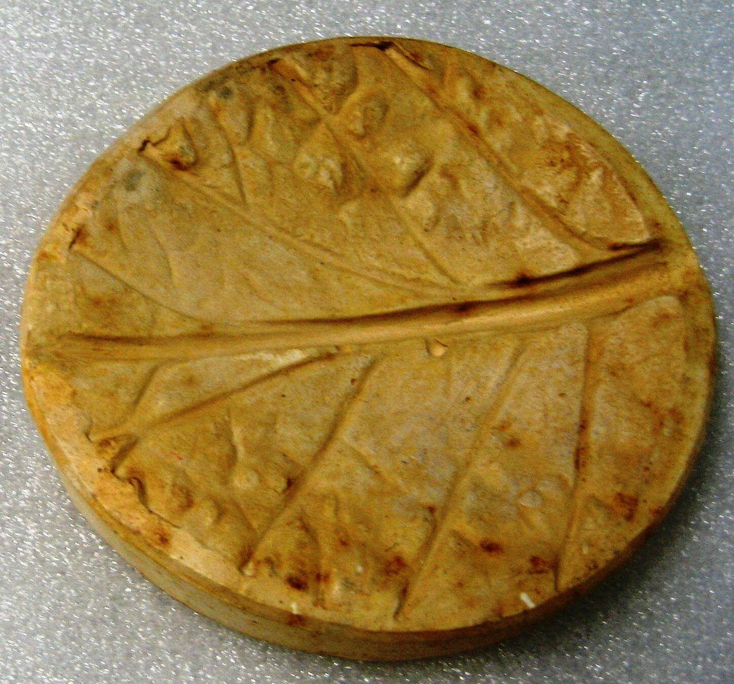 Plaster mould with indented leaf design. Depending on its size, such moulds were used with almond icing or marzipan for making handmade flowers appear more realistic (smaller sizes); or possibly used for biscuits (larger sizes).