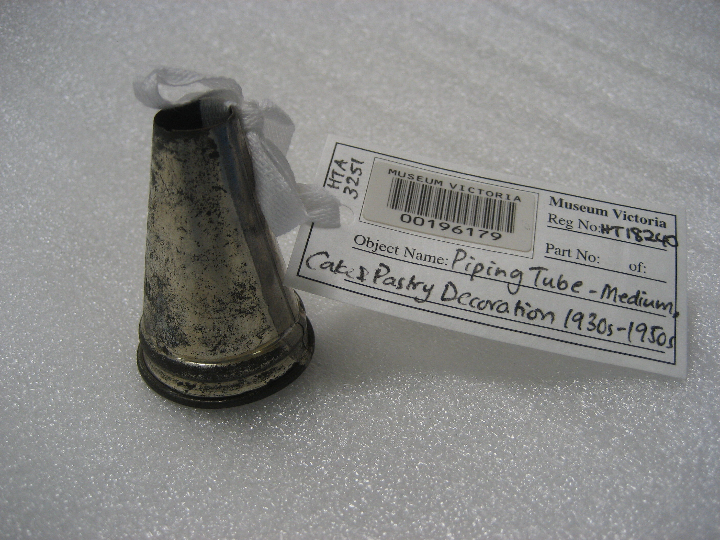 This piping nozzle belonged to German pastry chef Karl Muffler and was used by him during his career as a pastry chef and confectioner in Melbourne from the 1930s and during teaching cake decorating at William Angliss Food Trades School during the 1940s. The metal 'straight' shape tube was inserted into the base of a piping bag. The smaller tubes were used with bags filled with icing, marzipan and other decorative fillings and used for decorating cakes with patterns, edgings and borders. The larger tubes were used for filling sausage rolls, almond rings and fillings.