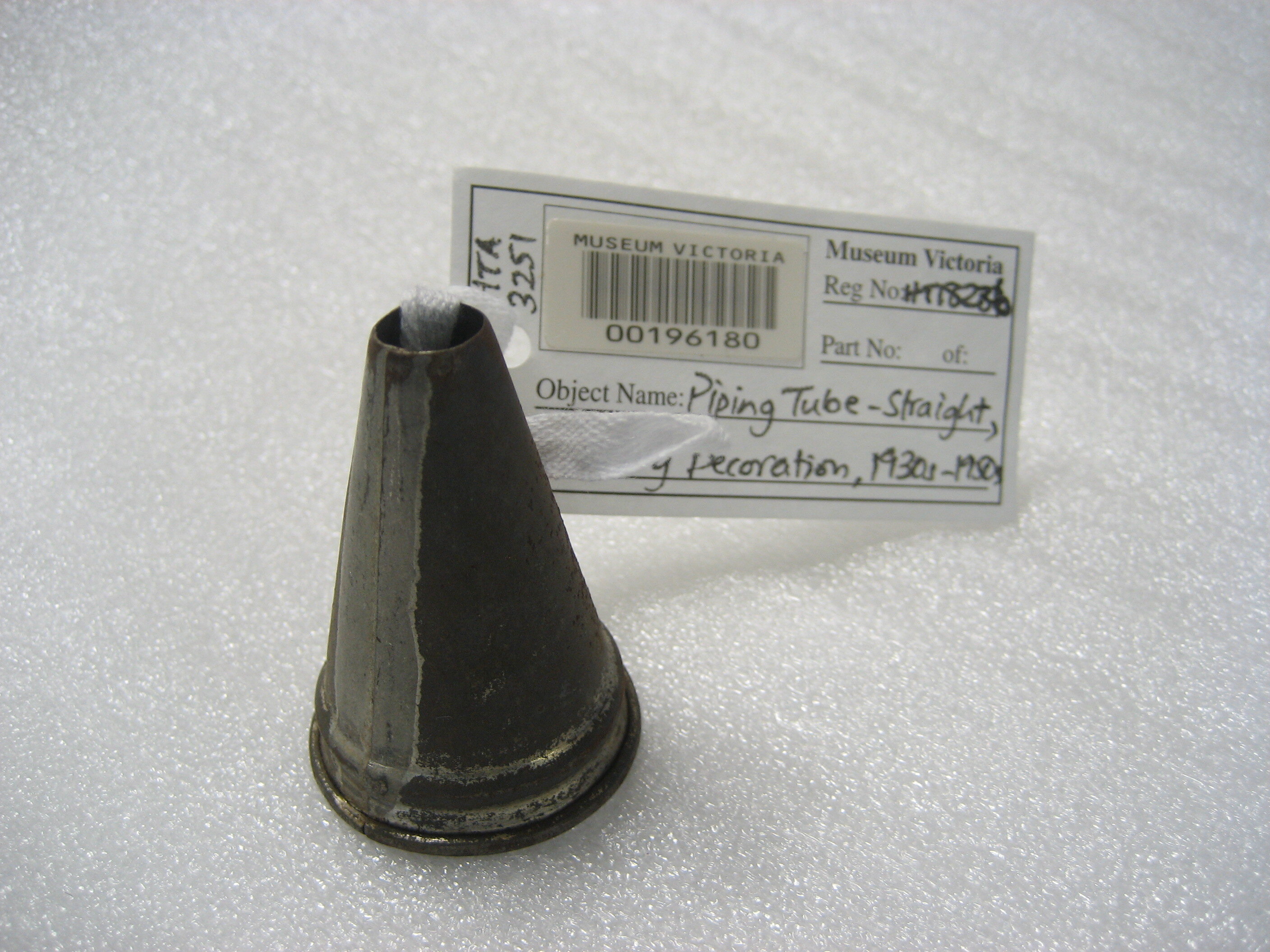 This piping nozzle belonged to German pastry chef Karl Muffler and was used by him during his career as a pastry chef and confectioner in Melbourne from the 1930s and during teaching cake decorating at William Angliss Food Trades School during the 1940s. The metal 'straight' shape tube was inserted into the base of a piping bag. The smaller tubes were used with bags filled with icing, marzipan and other decorative fillings and used for decorating cakes with patterns, edgings and borders. The larger tubes were used for filling sausage rolls, almond rings and fillings.