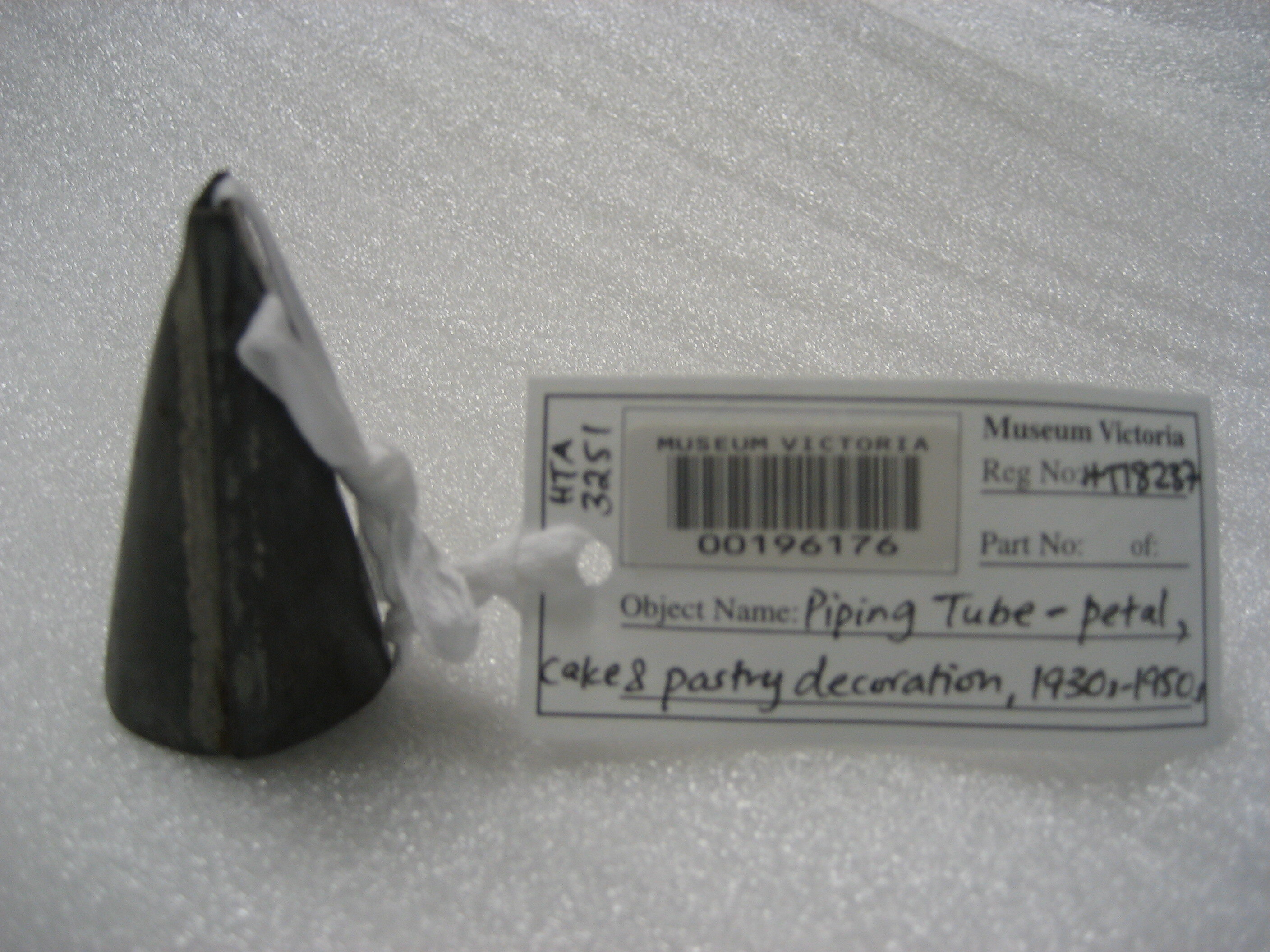 This piping nozzle belonged to German pastry chef Karl Muffler and was used by him during his career as a pastry chef and confectioner in Melbourne from the 1930s and during teaching cake decorating at William Angliss Food Trades School during the 1940s. The metal 'petal' shape tube was inserted into the base of a piping bag filled with icing, marzipan and other decorative fillings, and used for decorating cakes with patterns, edgings and borders.