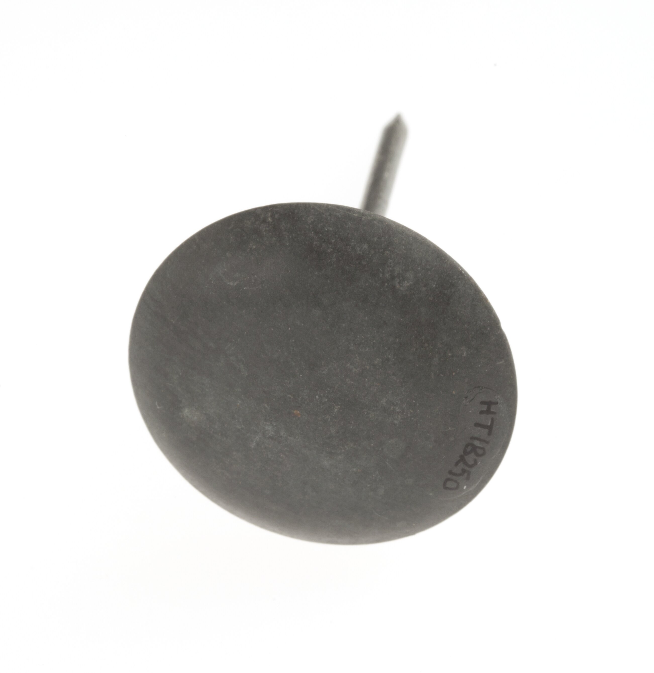 Metal 'flower pin' used for piping icing sugar flowers, the flat base of the pin then being used to lift flowers off surface post-formation.