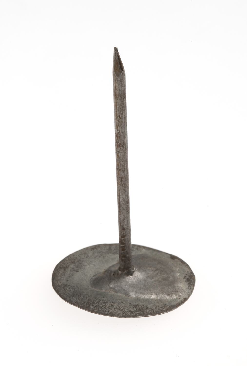 Metal 'flower pin' used for piping icing sugar flowers, the flat base of the pin then being used to lift flowers off surface post-formation.