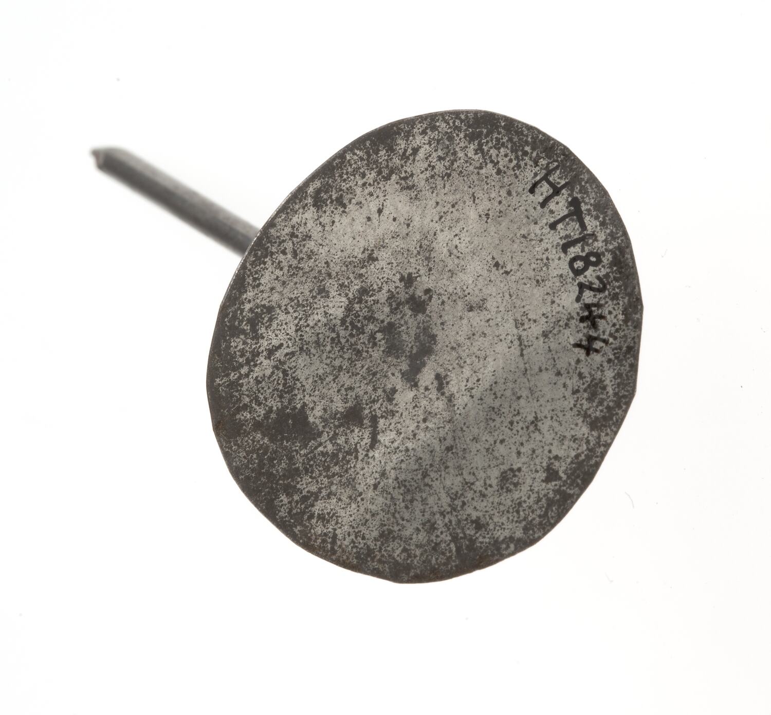 Metal 'flower pin' used for piping icing sugar flowers, the flat base of the pin then being used to lift flowers off surface post-formation.