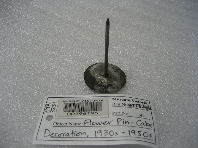 This metal flower pin was used for piping icing sugar flowers, the flat base of the pin then being used to lift flowers off surface post-formation. It belonged to German pastry chef Karl Muffler and was used by him during his career as a pastry chef and confectioner in Melbourne from the 1930s, and during teaching cake decorating at William Angliss Food Trades School during the 1940s.