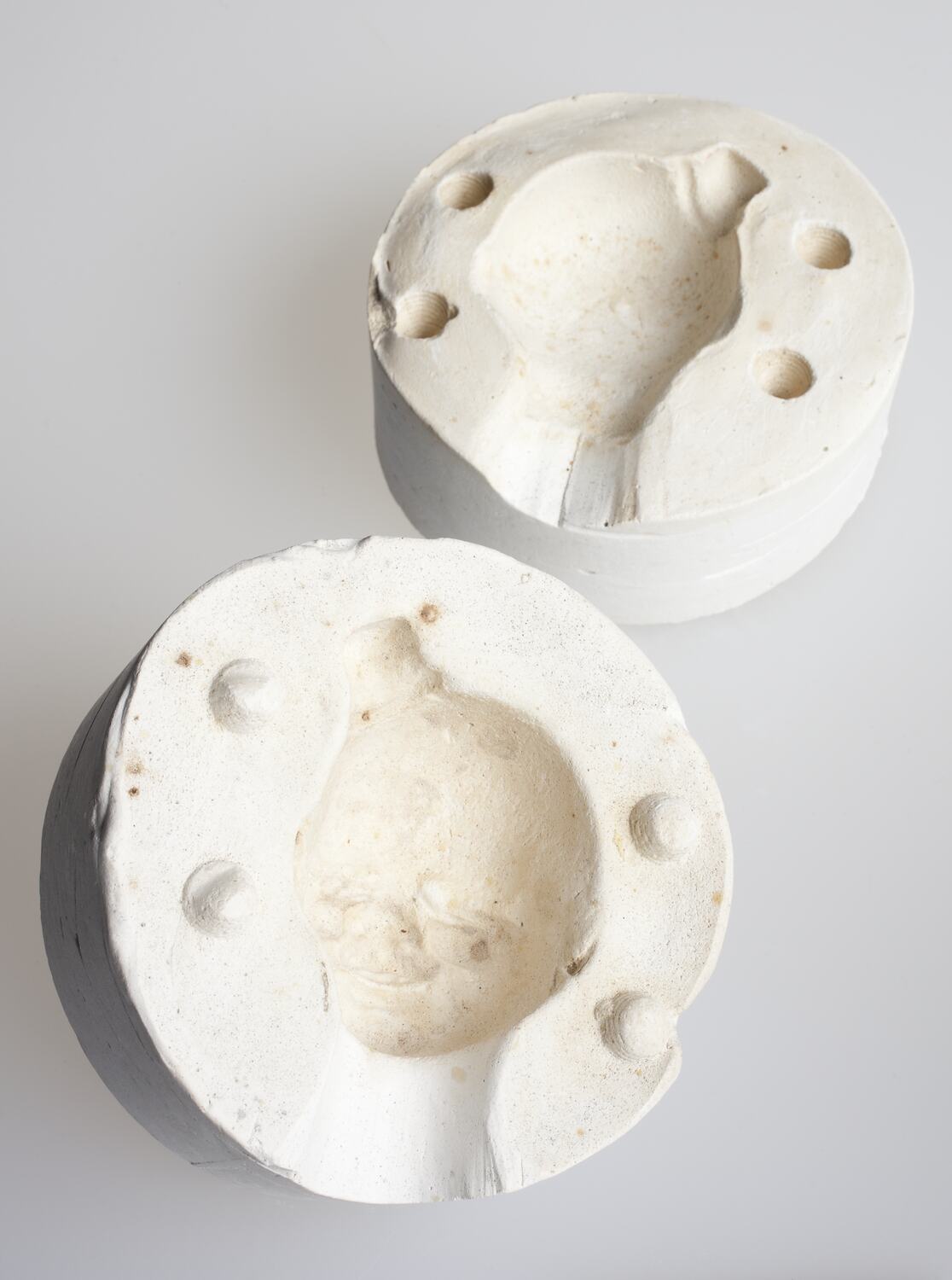Cylindrical plaster mould with hollowed-out clown head shape. Used for creating a clown head as decoration for cake by modelling icing around the mould created from plaster of paris, etc.