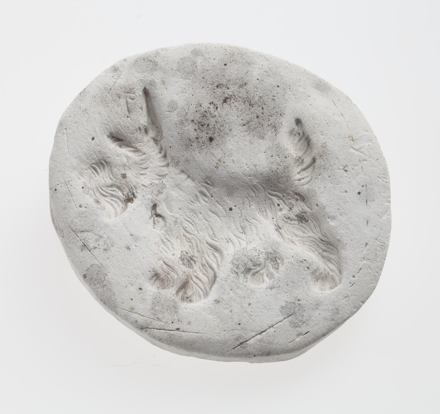 Flat plaster mould with indented dog-head shape. Used for creating a dog head as decoration for cake by modelling icing around the mould created from plaster of paris, etc.