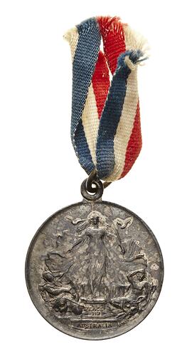 Of the commemorative medals issued to mark the end of the First World War, the most common was the so-called 'Peace' or 'Victory' medal issued to every child in Australia aged 0-14 years (and aged up to 16 if parents were in the armed forces). The medal was designed by Charles Douglas Richardson, better known for his work as a sculptor. Time constraints as well as pressure from the production of other victory medals meant that no single manufacturer could make the 1,670,000 medals. Six were therefore selected: Amor, Stokes, Schlank, Parkes, Angus & Coote (who later withdrew) and Platers. The medals were silvered bronze, with silver issues for special presentations. The Defence Department supplied a red, white and blue striped ribbon and pin. Distribution began in March 1919. Victorian school children received their medals on Friday 18 July and on 'Peace Day' on Saturday 19 July.