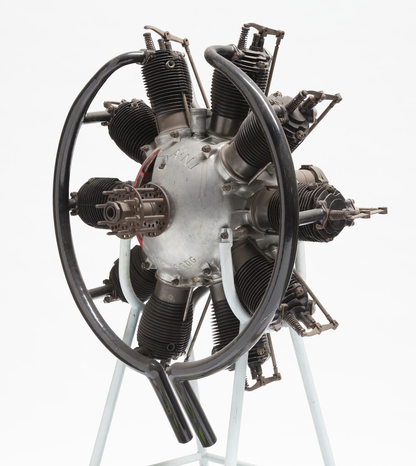 Air-cooled, ten-cylinder, 100 horsepower radial engine with maker's plate removed.