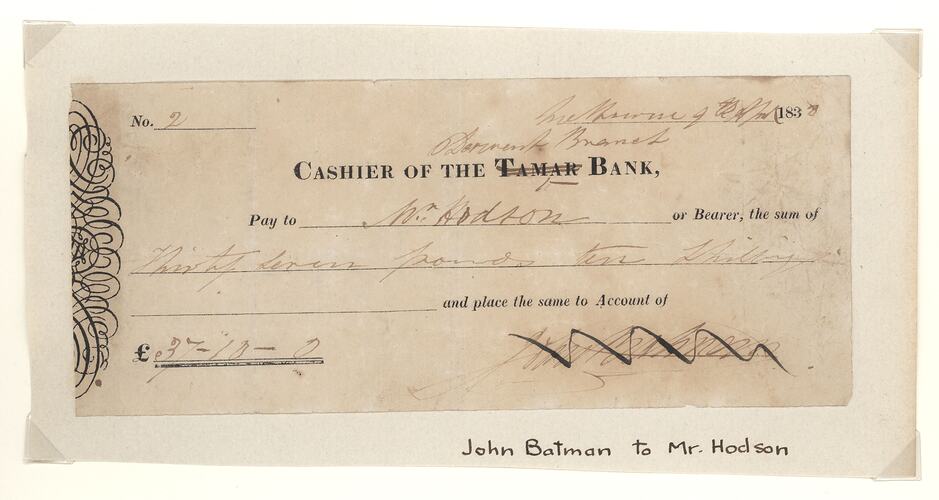 A printed cheque form of the Tamar Bank (180 * 77 mm) filled out by John Batman: No 2 Melbourne April 9th 1838 / CASHIER OF THE TAMAR BANK, (with TAMAR crossed out and Derwent Branch written above) / Pay to Mr Hodson or Bearer, the sum of / Thirty seven pounds ten Shillings / and place the same to Account of / L 37 - 10 - 0 John Batman (the signature is cancelled).