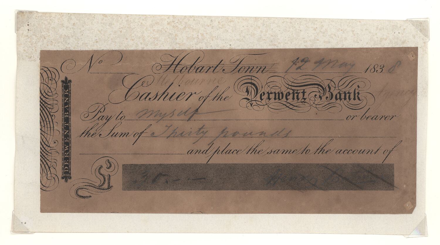 A printed cheque form of the Derwent Bank (182 * 80 mm) filled out by Henry Batman: No Hobart Town (crossed out and 'Melbourne' written below) 12 May 1838 / Cashier of the Derwent Bank / Pay to Myself or bearer / the sum of Thirty pounds / and place the same to the account of / L 30 . - . - Henry Batman (the signature is cancelled)