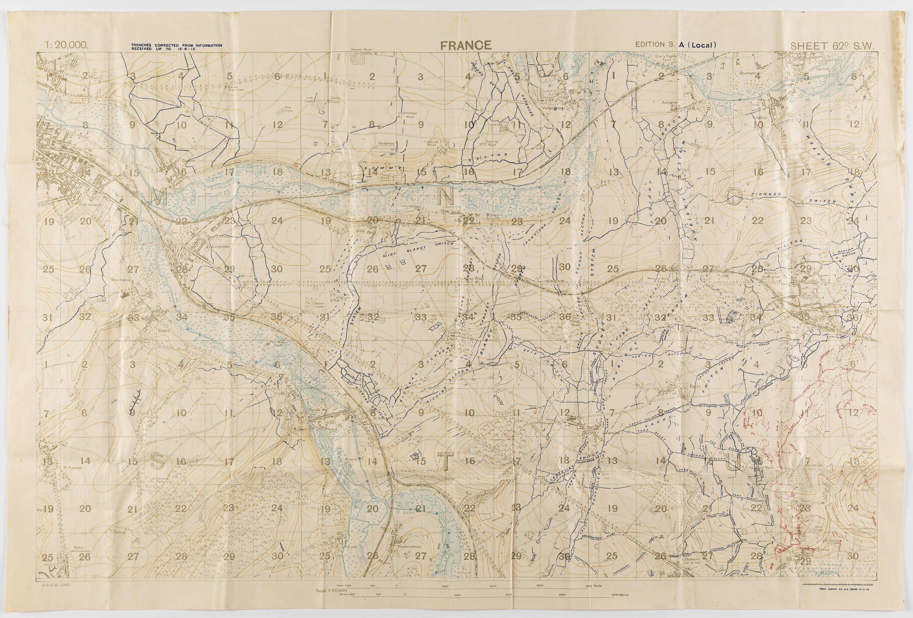 Printed on front: '1:20,000. / TRENCHES CORRECTED FROM INFORMATION / RECEIVED UP TO 15.6.18 / FRANCE / EDITION 3.A (Local) SHEET 62D. S.W. / G.S,G.S. 2742 / Ordnance Survey, (O.B.) June, 1918 [crossed out] / FIELD SURVEY CO., R.E. (3808) 18-6-18'.
