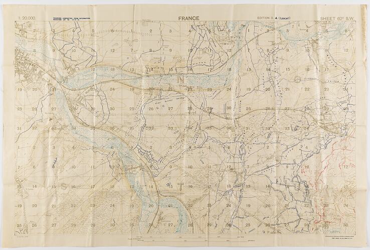 Used by Capt. M. Lewis during World War I. Captain Morris Lewis, 44th Battalion, Third Division, First AIF, was born in Wales in 1892 of Jewish heritage. He was a 23-year-old tailor living in Perth when he enlisted to serve in World War I. He applied for a commission in May 1916, and left Fremantle for England on 6 June 1916, where he received training. Lewis was sent to the front in France in November 1916. He was serving with the 44th Battalion in the vicinity of Villers-Bretonneux in June 1918, when this map was printed.