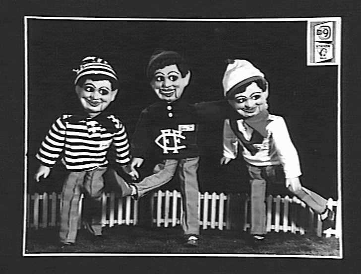 Three Gerry Gee junior dolls in Australian Rules Football colours. They wear jumpers for the Geelong, Carlton and South Melbourne football clubs.