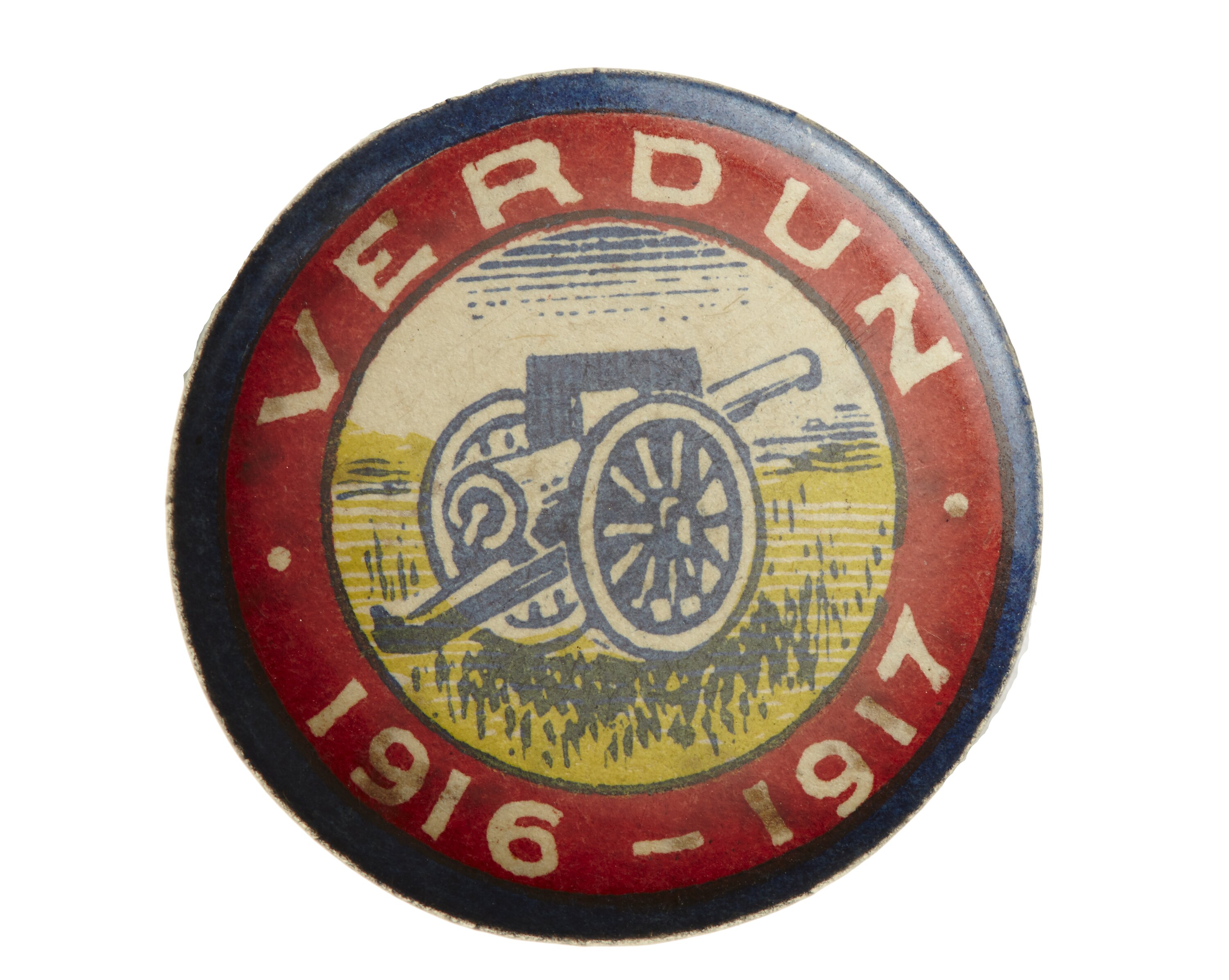 A round badge with pin on back. The obverse features a mobile cannon facing right; around in white on a broad red border, VERDUN 1916 - 1917